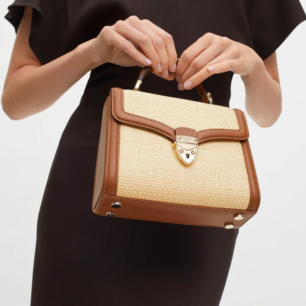 Aspinal of London – Midi Mayfair Natural Raffia & Smooth Tan Leather Top Handle Bag