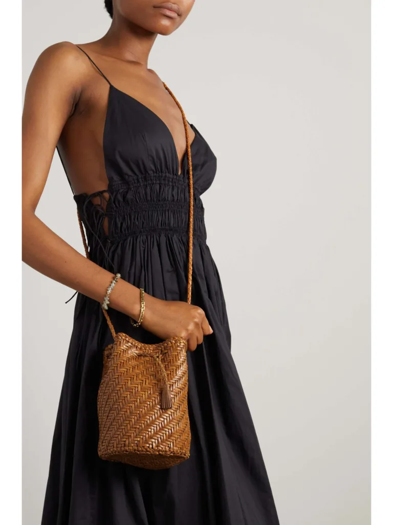 PomPom Double Jump Woven Tan Leather Bucket Bag –